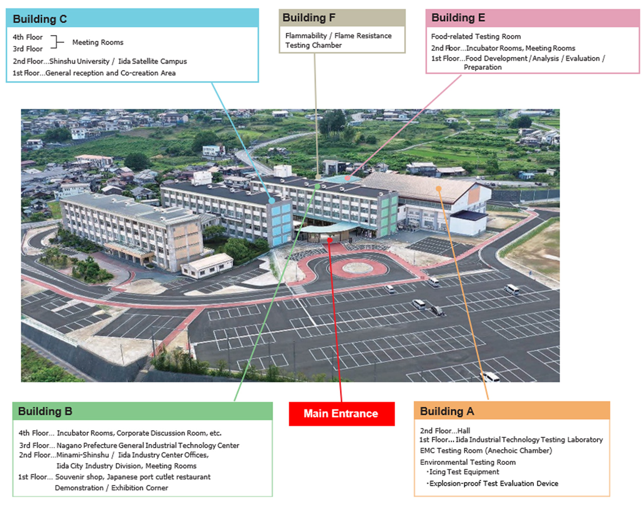 S-BIRD has comprehensive test laboratories geared toward aeronautic technology and local industry. Furthermore, there is research and education performed through our standing as a campus with “Aircraft System Collaborative Research Courses” held by Shinshu University. Minami Shinshu Wide Area Union also serve as an administrative window for technological and managerial support for businesses and entrepreneurs, and has the ability to broadcast the allure of local products of Iida region.